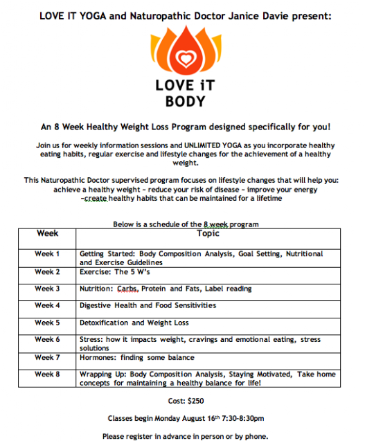 LOVE IT BODY – An 8 week healthy weight loss program LOVE IT YOGA ~ 134 Richmond St Amherstburg ~ 519-736-4500 Submit a Comment Cancel replyYour email address will not be published. Required fields are marked *Comment * Name * Email * Website Save my name, email, and website in this browser for the next time I comment.